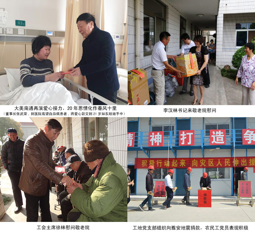 公司成立二十五年以來,從初期連續(xù)十年支助二個(gè)孤兒開始,先后資助新疆伊犁多名貧困學(xué)生,連續(xù)多年看望慰問幸福敬老院、秦灶敬老院、唐閘敬老院、市北養(yǎng)老中心的老人,對(duì)素不相識(shí)的癌癥病人、重危病人、交通事故致殘人員、燒傷燙傷等病人給予醫(yī)療費(fèi)支助,向四川汶川、雅安、青海玉樹、云南魯?shù)榈卣鹫饏^(qū)和鹽城6.23特大龍卷風(fēng)等災(zāi)區(qū)積極捐款,樂施港閘市政人的援助之手,為使愛心傳承更久遠(yuǎn),施援更高效,公司已分別在南通市慈善總會(huì)、港閘區(qū)慈善總會(huì)冠名了各100萬元的愛心基金,為特困人群雪中送炭,讓愛的種子、好人文化在港閘市政薪火相傳。